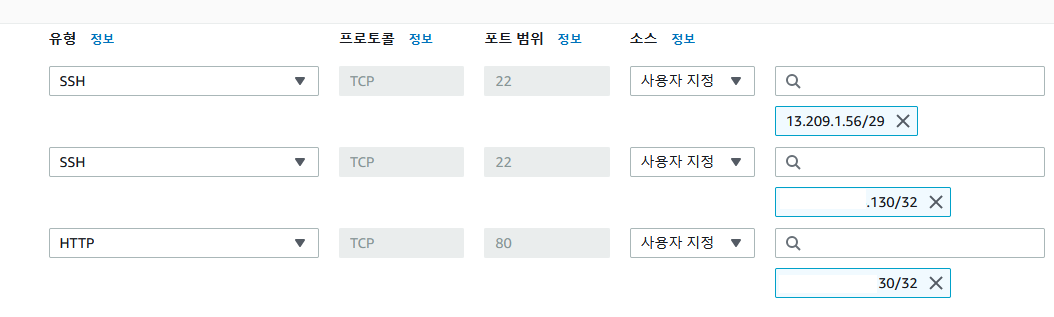 * 위의 웹 접근시 나온 정보 (13.209.1.26/29)를 SSH 접근하도록 설정하면 EC2를 웹에서 연결 가능함.