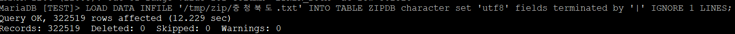 MariaDB [TEST]> LOAD DATA INFILE '/tmp/zip/강원도.txt' INTO TABLE ZIPDB character set 'utf8' fields terminated by '|' IGNORE 1 LINES;